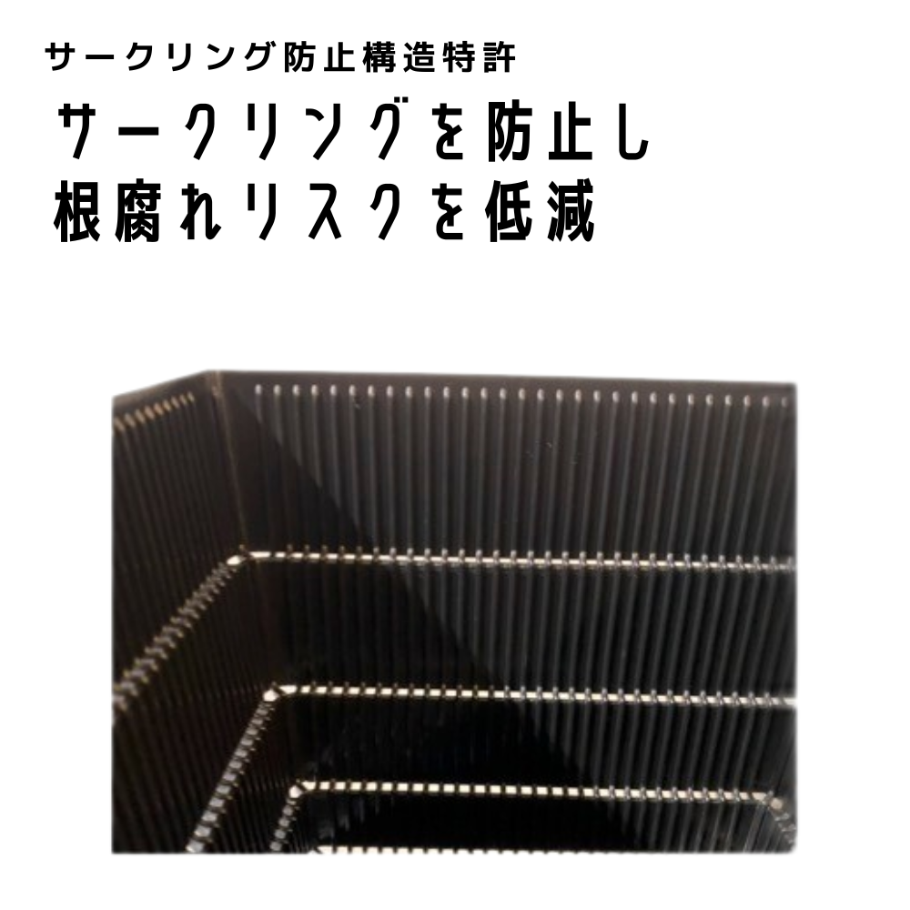従来の鉢の最大の問題「サークリング現象」を完全解決 ─ この現象は、根が鉢壁に到達すると円を描くように巻き続け、やがて「根鉢状態」となって養分や水分の吸収効率が著しく低下する現象です。当商品の「サークリング防止構造特許」は、根が鉢壁に到達する前に自然な枝分かれを促し、健全な放射状根系の形成を実現します。
