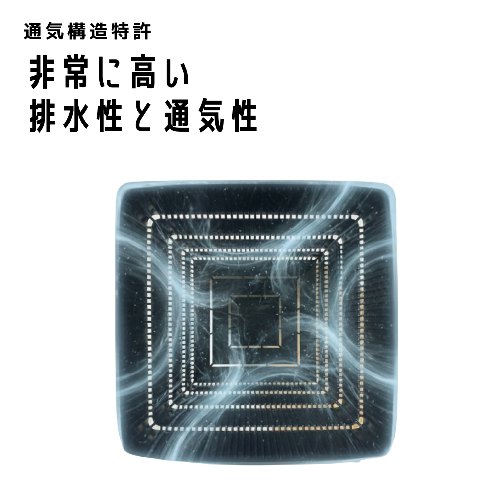 「通気構造特許」による理想的な根域環境 ─ 植物の根は酸素を必要とする好気性組織です。側面と底面に配置された通気孔により、土壌中の酸素濃度を最適に保ち、根の呼吸活動を活発化。同時に過剰な水分を効率的に排出し、根腐れの原因となる嫌気状態を防ぎます。