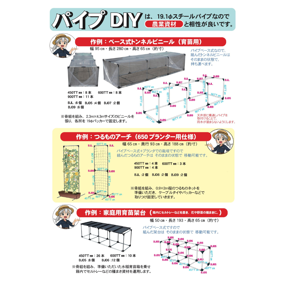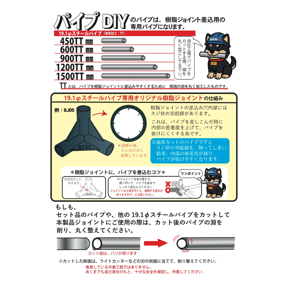 プロ仕様の19.1φパイプ&5種類の専用ジョイント 南榮工業の「パイプDIY」は、19.1Φスチールパイプと専用オリジナル樹脂ジョイントを組み合わせることで、誰でも簡単に様々な構造物を製作できるDIYシステムです。