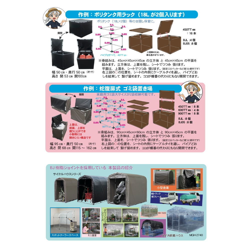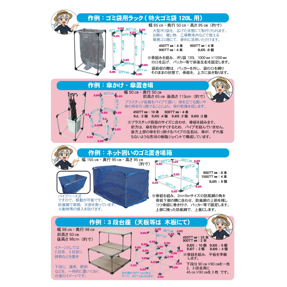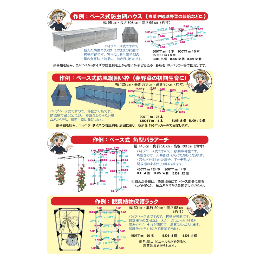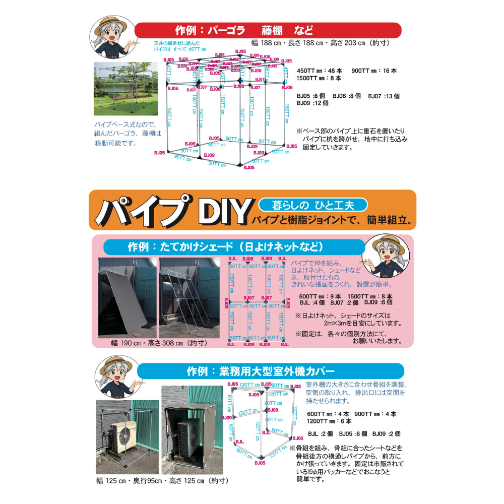 | 注意事項 | ・パイプのサイズは樹脂ジョイントに挿入込みでの実寸となるため、単品購入した際の長さと異なります ・パイプのカットには、パイプカッターなどの工具が必要です ・屋外で使用する構造物は、風雨や強風に対する固定をしっかり行ってください ・大型の構造物を製作する際は、安全性を考慮した設計をお願いします ・ビニールやネットを取り付ける際は、別途購入が必要です ・詳細な作例については、商品画像のQRコードからご確認いただけます |