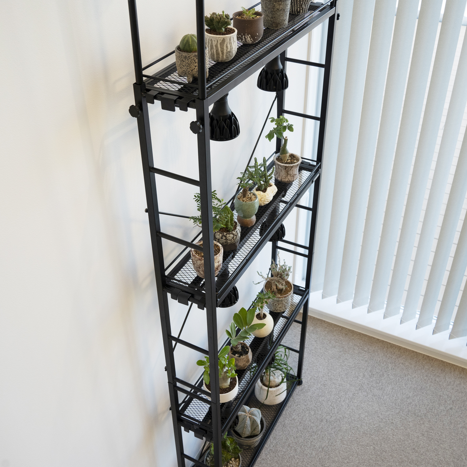 棚板には通気性に優れたメッシュ素材を採用。鉢底が蒸れにくく、育成ライトの光やサーキュレーターの風がラック全体に効率よく行き渡ります。根腐れのリスクを軽減し、植物が健康に育つ環境を維持します。