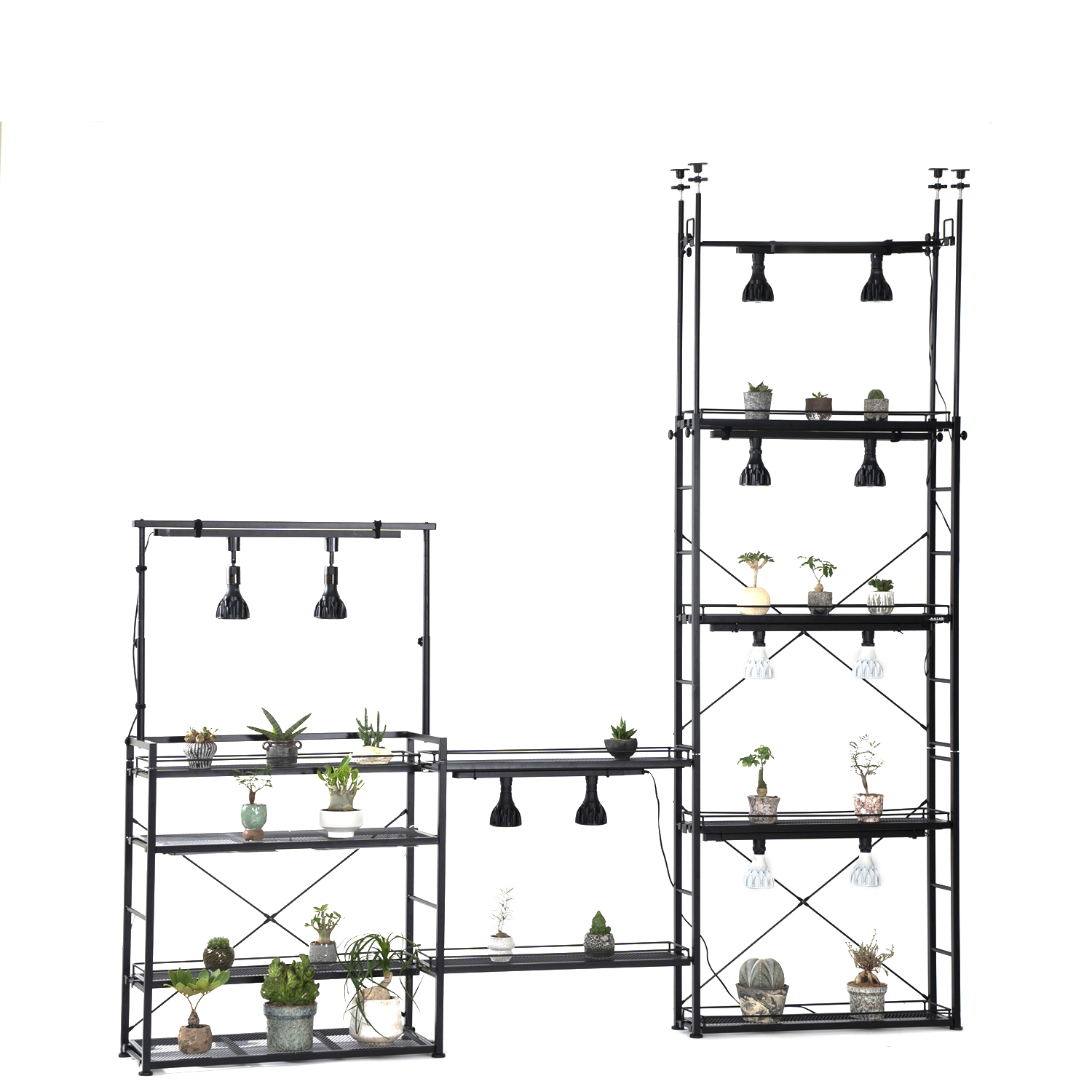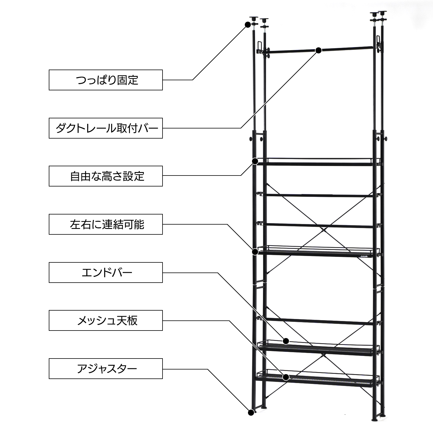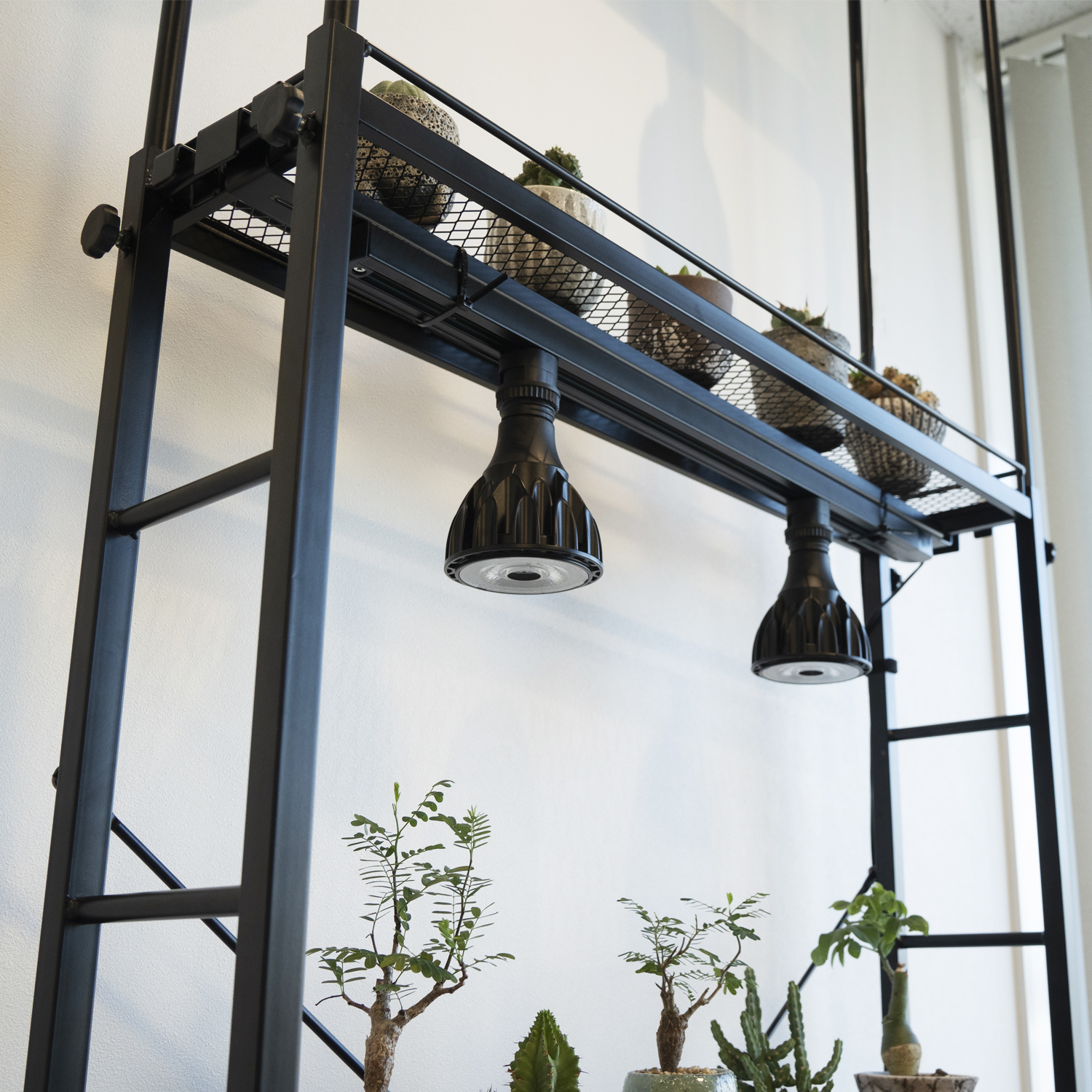 棚板とダクトレール取り付けバーは、それぞれ高さを自由に調整可能。アガベなどの鉢植え植物はもちろん、ビカクシダなどの吊り下げ植物も美しくディスプレイできます。さらに左右に連結できる設計なので、コレクションが増えても育成スペースを簡単に拡張。シンプルな構造でDIYが苦手な方でも組み立てやすい設計です。