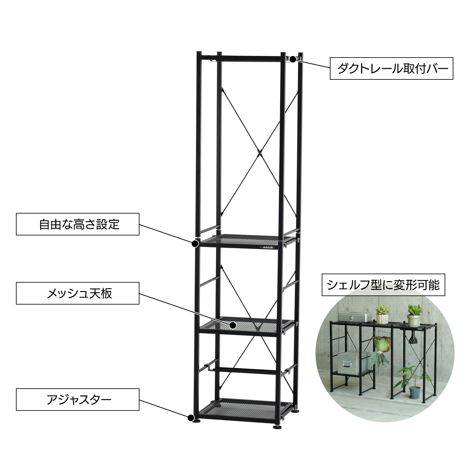 シンプルな設計により、DIYが苦手な方でも簡単に組み立て可能。付属パーツは本体フレーム×4個、メッシュ天板×4枚、ダクトレール取り付けバー×2本、アジャスター×8個、クロスバー×8個で構成され、わかりやすい取扱説明書も完備しています。