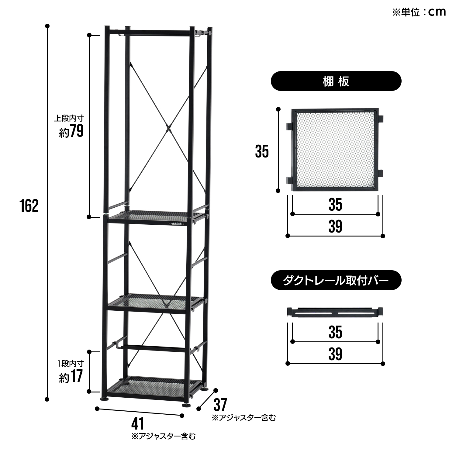 | サイズ | ・縦型ラック時:幅41×奥行き37×高さ162 cm ・横型シェルフ時:幅116×奥行き37×高さ81 cm |