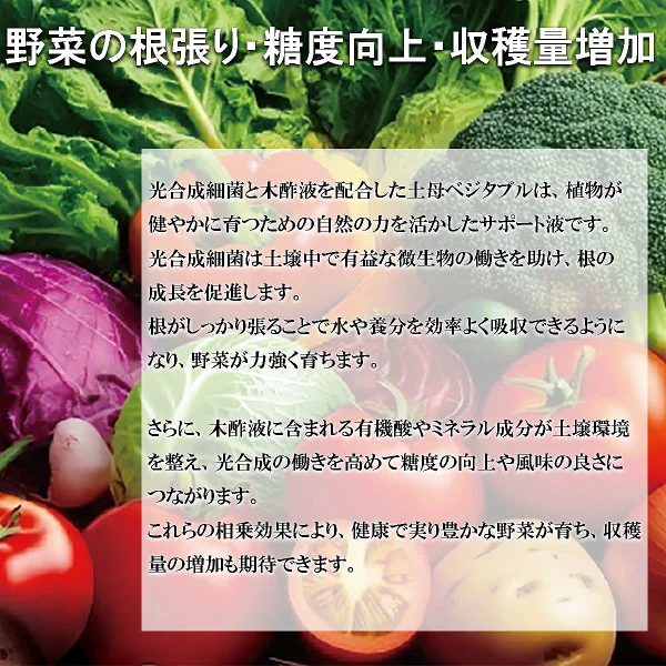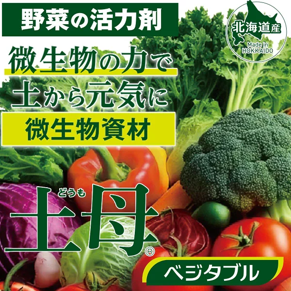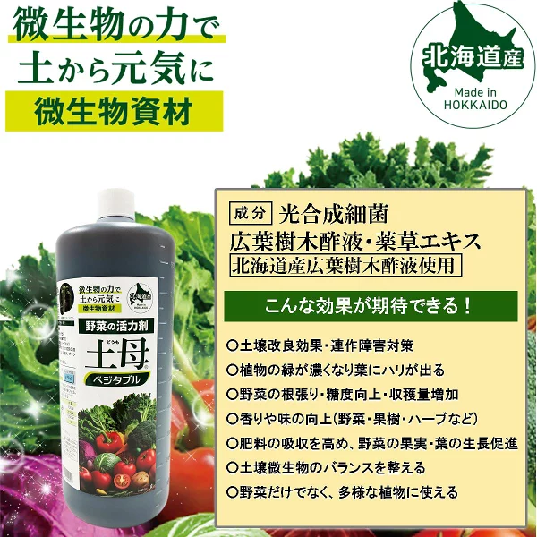 北海道産の微生物資材を使用した、環境にも野菜にも優しい土壌改良&活力液—それが土母ベジタブルです。1L容量で、畑でもプランターでも手軽にお使いいただけます。