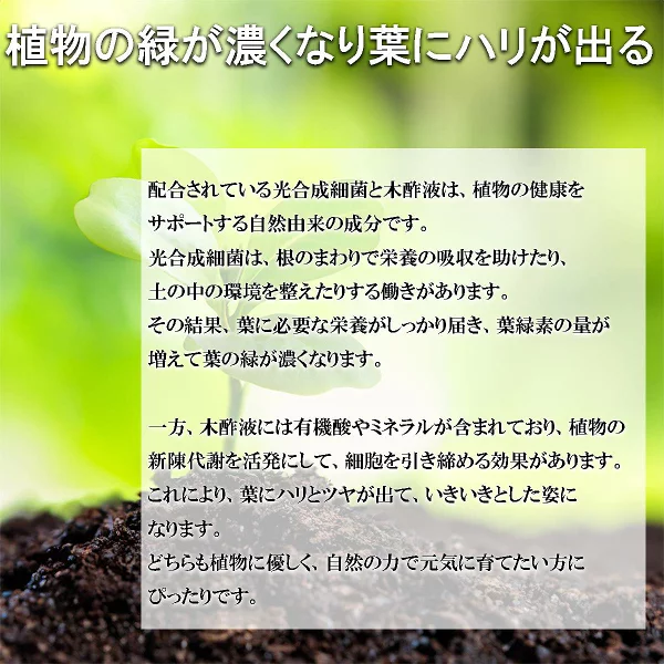 木タールを除去した安全な北海道産広葉樹木酢液を配合。有益な微生物の働きを助け、土壌のバランスを整えます。化学物質に頼らない、自然の力で土壌環境を改善します。