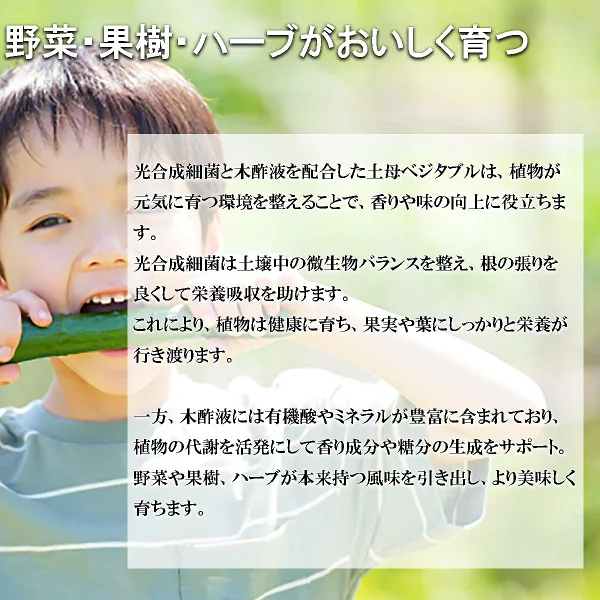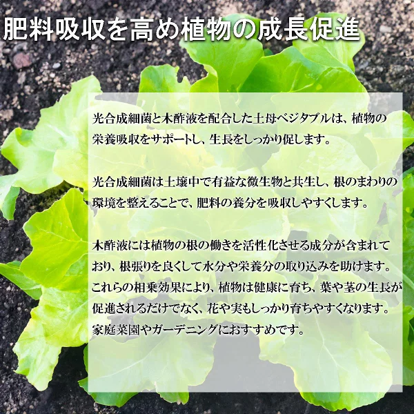 本品は、農薬・肥料ではありません 植物ごとに合わせた肥料を別途与えてください 必ず水で薄めて使用してください 希釈した液は当日中にお使いください 「土が喜ぶと、野菜が応える」—その真実を実感できる「土母ベジタブル」。微生物の力で土壌環境が整い、味と香りがアップした野菜を収穫する喜びを、ぜひ体験してください。きっと、あなたの家庭菜園がより一層充実したものになるはずです。