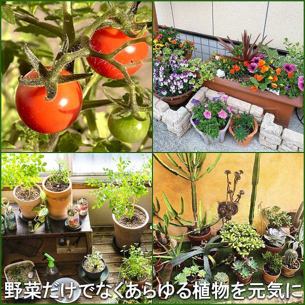 野菜だけでなく、花など多様な植物にも使用できます。バラ、観葉植物、多肉植物など、幅広い植物の活力剤として活躍します。