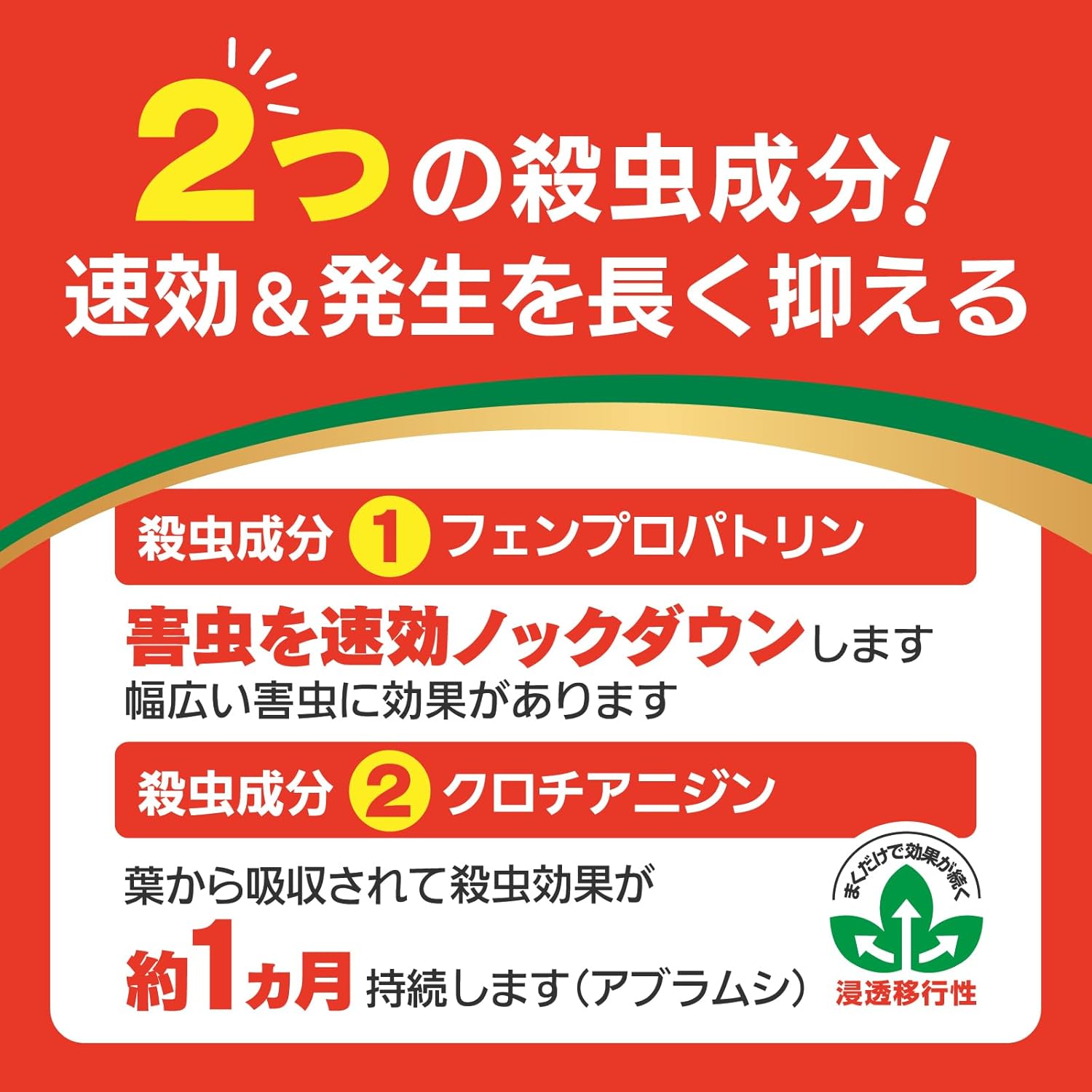 害虫が発生したら即座に対応できる速効性と、その後約1カ月効果が続く持続性。この2つを同時に実現することで、害虫の増殖を効果的に抑えます。