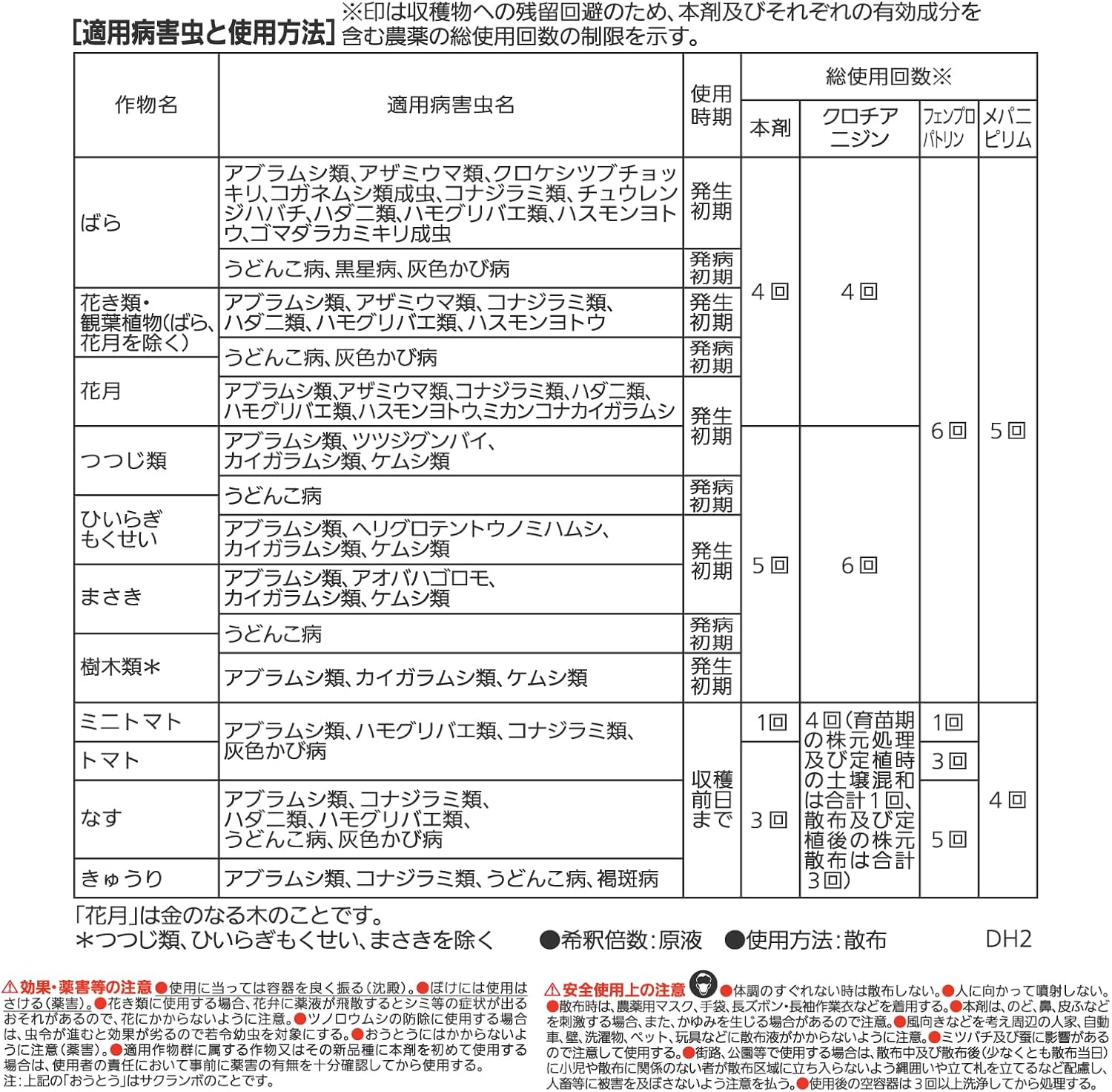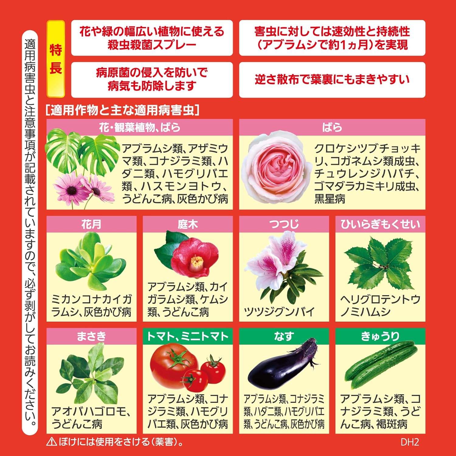 | 素材 | ・クロチアニジン:害虫に対する速効性と持続性(アブラムシで約1カ月) ・フェンプロパトリン:速効性の高い殺虫成分 ・メパニピリム:病原菌の侵入を防ぐ殺菌成分 ・【薬剤登録】 農林水産省登録第22506号 ・【性状】 類白色水和性懸濁液 ・【剤型】 スプレー剤(希釈不要) |