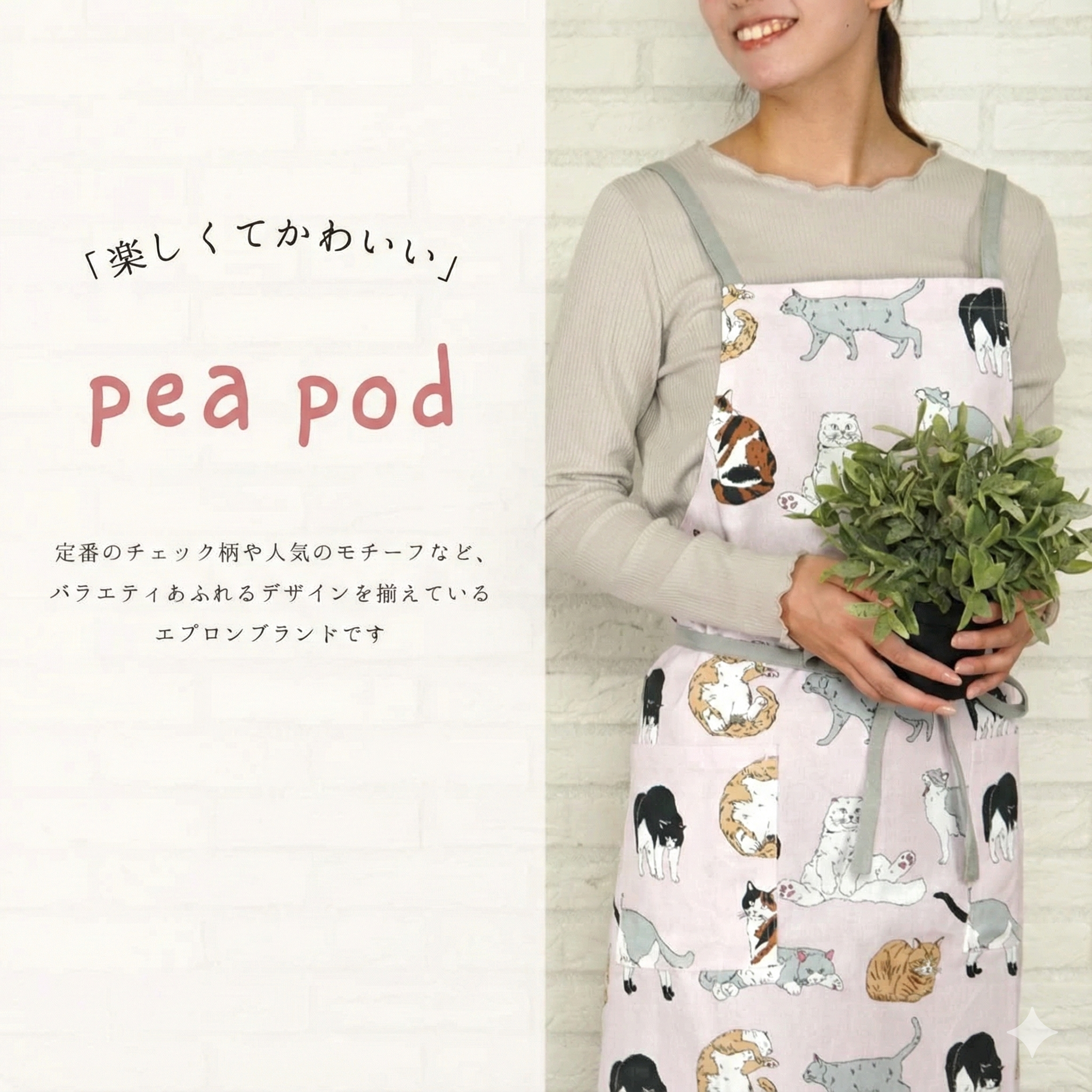 猫好きのための「peapod(ピーポッド)にゃんこ柄ショートエプロン」。綿100%のやさしい着心地、バッククロスで疲れにくい設計、ポケット付きで機能的。75cm丈のショート丈で動きやすく、かわいい猫デザインが毎日を明るくします。自分へのご褒美にも、大切な人へのプレゼントにも最適。ユーコンシェルジュでは、フレンズヒル公式品質の商品を安心してお届けします。